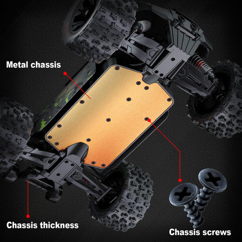 - Aluminum Alloy Chassis: Made of 6061 aluminum, the laser-etched chassis plate with a metal center body support and strong composite brace for maximum durability. Designed to resist impacts and minimize damage, its reinforced and upgraded chassis ensures it can handle the toughest terrains, offering up to 50% longer durability than typical models.