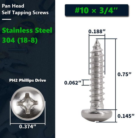 - Thread Size: #10 x 3/4"; Thread Length: 3/4 inch or 19mm (not including the head)