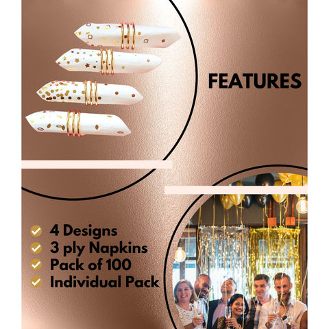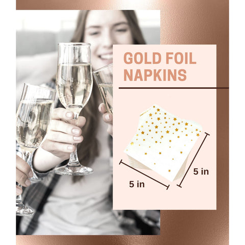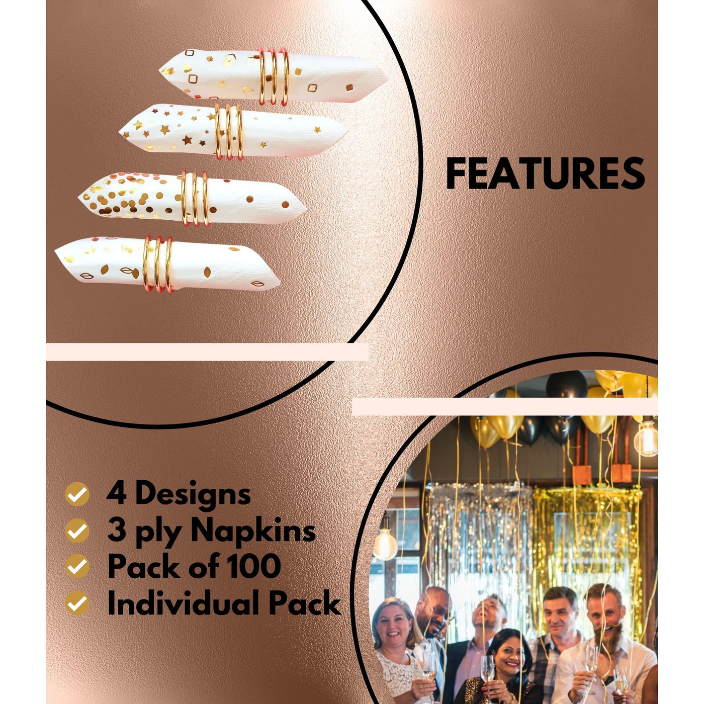 - πΆ ππ‘πππ¨πππ¦: 100 pack assorted cocktail napkins with 4 different gold foil designs (25 sheets for each style and packed individually). Measures approximately 10 x 10 inches unfolded; 5 x 5 inches folded.