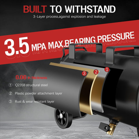 - Safety Focused Air Compressor: The air compressor tank is equipped with two large cooling fans and automatic overheating protection to prevent damage. Additionally, the compressor will automatically shut off or provide pressure relief protection when the current or storage pressure is too high. When the internal pressure drops below 70 PSI, the motor will restart for approximately 30 seconds to ensure continuous use