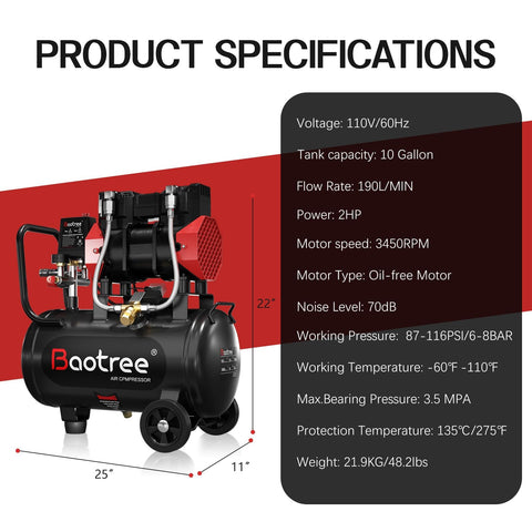 - 10 Gallon Ultra Quiet Air Compressor: Designed for easy mobility, this portable air compressor comes with a lightweight storage tank, handle, and wheels. It is powered by an 8-gallon pressure tank and a 2HP oil-less motor that operates at 110V, delivering 8.76 CFM at 115 PSI and 3450 RPM