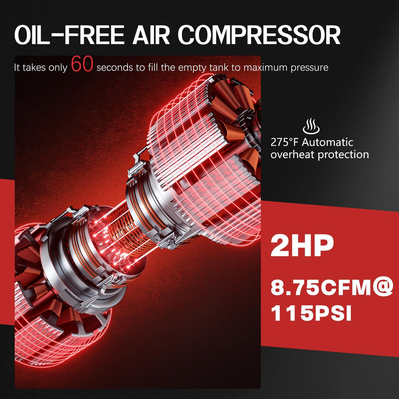 - 60 Second Tank Fill, Adjustable Pressure: Our oil-free air compressor features a single tube and double cylinder intake system. This design slashes inflation time and effort, making it highly efficient. Equipped with a 2HP pressure tank, the air pressure is adjustable from 0 to 115 PSI. It can fill an empty tank to its maximum pressure in a mere 70 seconds. The intake pipe, made of high-temperature resistant silicone and stainless steel braided mesh, offers dual protection against damage and corrosion, ensuring long-term reliable use.