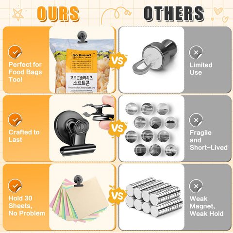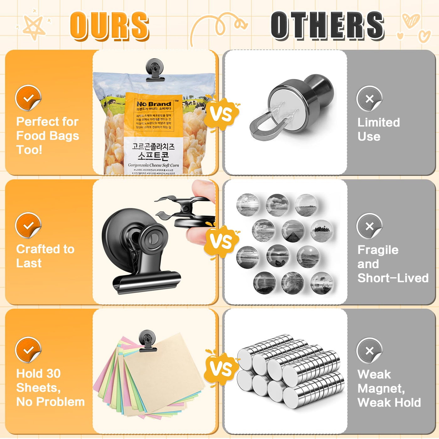 - š»ćMagnetic clips for refrigeratorćThe magnet clips are made of high-quality metal with color-printed, rust resistance, it is equipped with a magnet that is strong enough to hold 25 sheets of A4 together on a metal surface.
