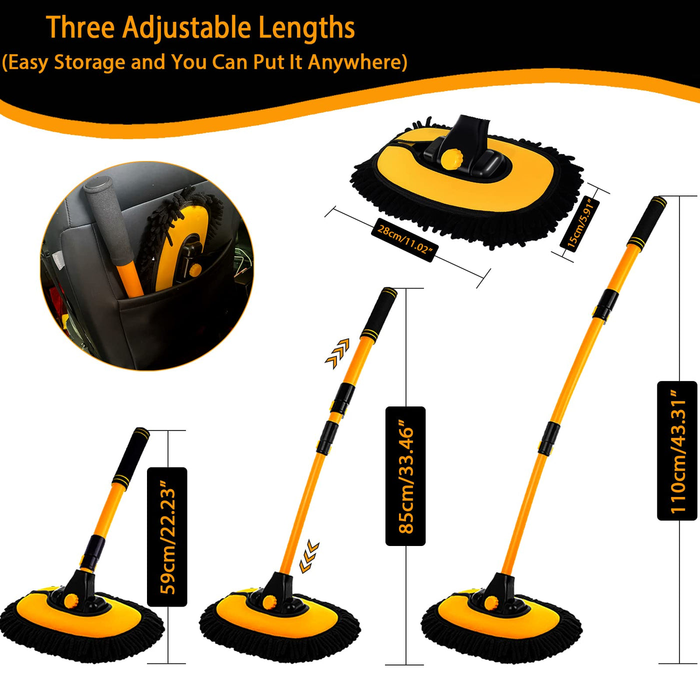- 43" Retractable 15° Curved Rod Car Wash Mop : Compared to other straight handle brushes, our wash brush has 15° bend design, so that you can wash the car with less effort,reduce the height requirements when in use, making it easy to clean the roof and other difficult to clean height.At the same time, the 43" three section telescopic lengths of 22inch/59cm,33inch/85cm, 43inch/110cm can meet the cleaning requirements of different heights without straining your back and getting your body wet