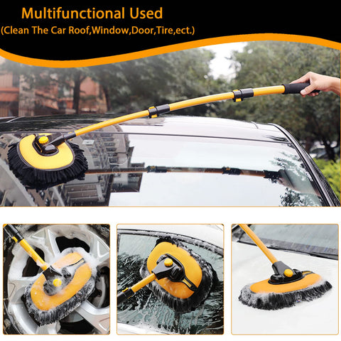 - 90° Rotating Easily Disassemble Car Washing Brush: This 90° rotating design can help you clean different angles avoid stretching, bending or raising hands, to clean everywhere.The disassemble design makes the telescopic cleaning brush easy to take the mop head apart from the mop rod and put it anywhere without taking up a lot of space when you don't need it.
