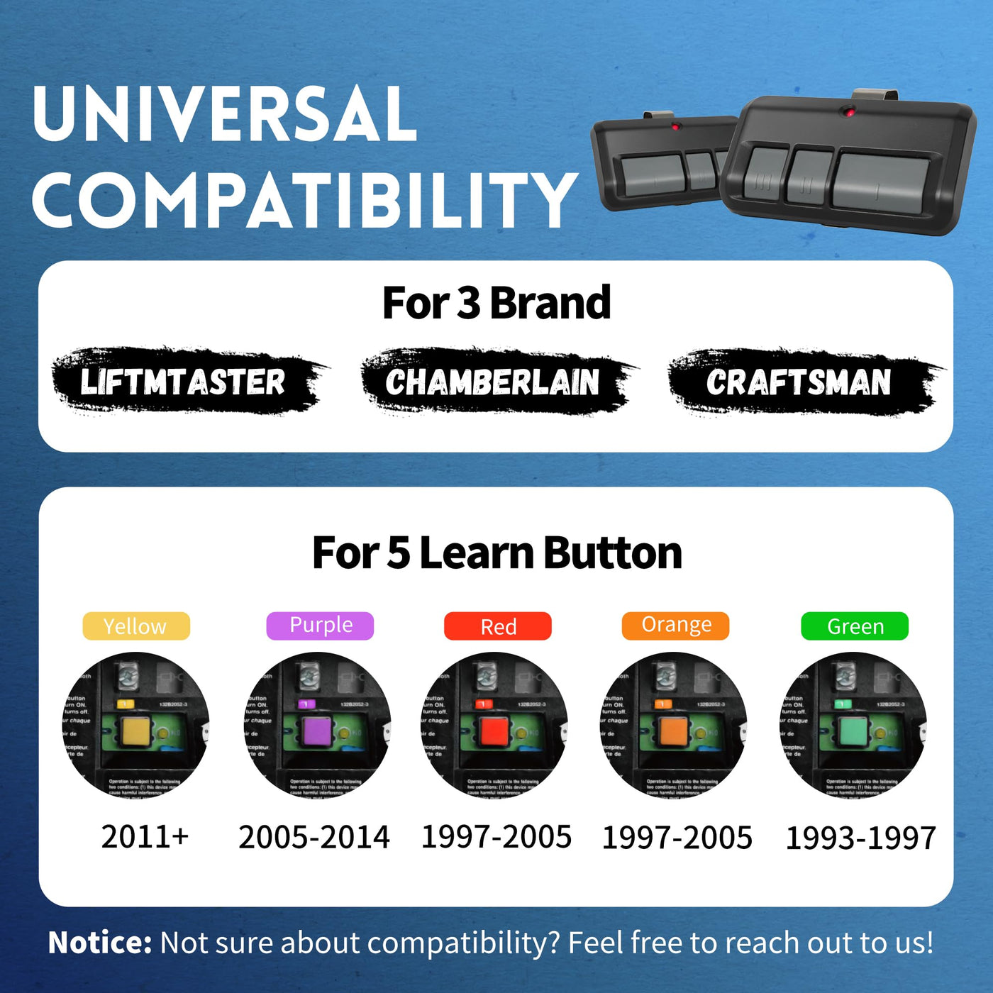- Universal: Works on LiftMaster, Chamberlain and Craftsman garage door openers manufactured from 1993 to current; Compatible for 3 different frequencies of security rolling code, it’s the easy option for adding an extra remote to multi-car families or for replacing lost or broken remotes