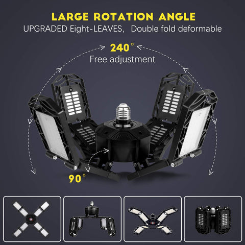 - 【Eight-Leaves Deformable Super Bright LED Garage Lights】- With 8 ultra-bright adjustable LED pannels. It features with 8*24 PCS top quality diodes that total 20000 lumens, CRI80+, 6500K daylight can give you 85% energy saving for your garage. The upgraded lighting fixtures have sufficient brightness and are the preferred choice for work.