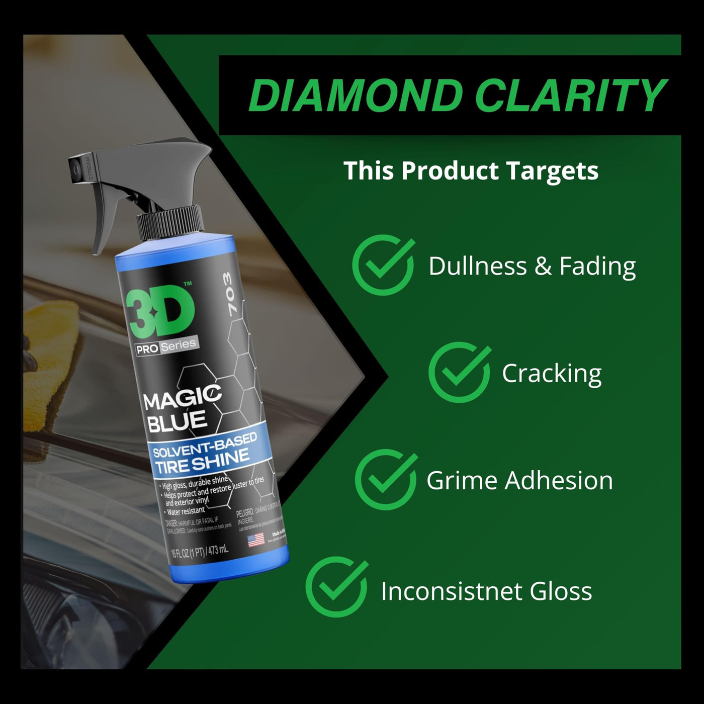 - Water Repellant Rain Ready Protection: 3D Magic Blue is a solvent-based tire shine that repels water and road spray. Perfect for wet conditions, this high-gloss formula clings to rubber and plastic, giving your tires a deep, black shine that stays put, rain or shine