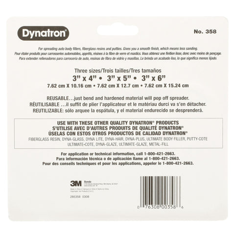 Details: The Right Sizes for Just the Right Surfaces This 3-pack of 3" x 4", 3" x 5" and 3" x 6" Dynatron spreaders ensures that you’ll always have the right size filler spreader to create your best work in auto body repair. DynatronTM 3-Pack Spreaders gives you reliable tools for a large range of auto body filling projects using fillers, glazes, putties and caulks. Flexible edges make applying, spreading and shaping fast and easy. All spreaders are reusable, as cured filler material separates cleanly and completely from the spreader surface leaving it clean and ready for the next use. Dynatron and the Science of 3M DynatronTM 3-Pack Spreaders deliver much more than the right size spreader for the job. Each spreader is built for ease of use, fast cleaning and long product life - just what you need for an efficient and well-run collision repair business. A brand of 3M, Dynatron delivers science-driven benefits specifically for aftermarket auto body repair and maintenance. DynatronTM 3-Pack Spreaders deliver much more than the right size spreader for the job. Each spreader is built for ease of use, fast cleaning and long product life – just what you need for an efficient and well-run collision repair business. A brand of 3M, Dynatron delivers science-driven benefits specifically for aftermarket auto body repair and maintenance.