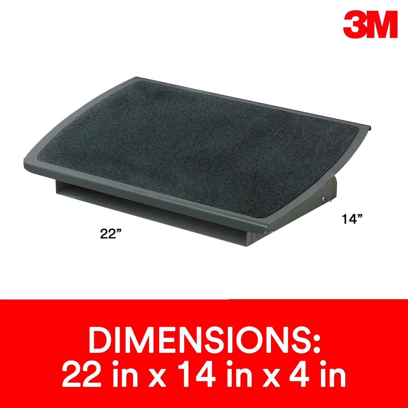 3M foot rest helps reduce strain and fatigue on legs, back and neck. It is height and tilt adustable with easy, foot-controlled, platform tilt adjustment. Extra Wide 22" Platform with Safety-Walk Slip Resistant Surface Provides Ample Room for Both Feet. Sturdy heavy duty steel base stays in place.
