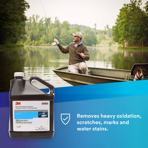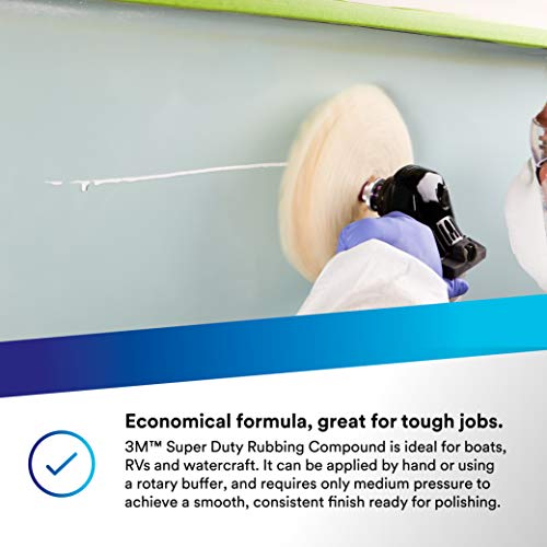 Details: 3M™ Super Duty Rubbing Compound aggressively removes heavy scratches, marks and oxidation from aluminum and gelcoats, ideal for boats and watercraft. It can be applied by hand or using a rotary polisher, and requires only medium pressure to achieve a smooth, consistent finish ready for polishing. This heavy-cut compound stays wet for a long time, so you can cover more surface without having to reapply it.