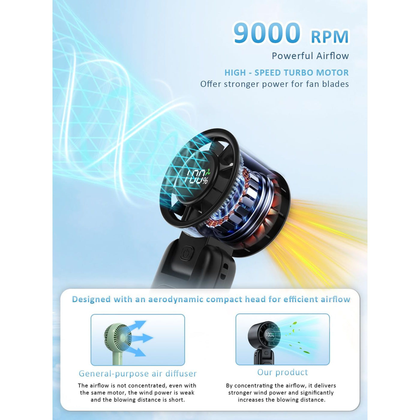 - ๐ท๐๐๐๐๐๐๐ ๐ป๐๐๐๐ ๐ญ๐๐ ๐๐๐๐ 9000 ๐น๐ท๐ด Equipped with a high-speed brushless motor and 7 turbine blades, this fan delivers strong airflow up to 9000 RPMโ3ร stronger than standard mini fans, cooling you instantly.
