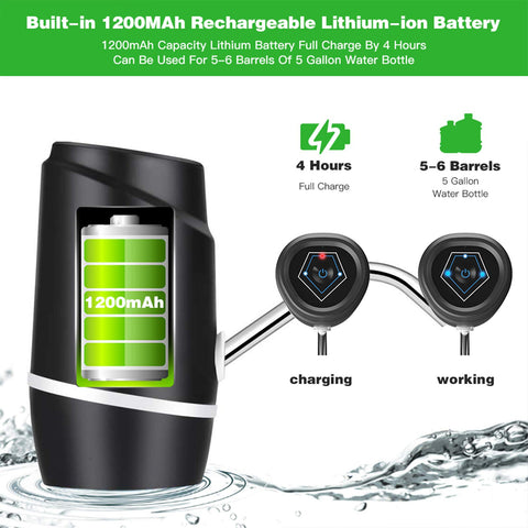 - 【ELECTRIC WATER PUMP DISPENSER WITH RECHARGEABLE BATTERY】Water Jug Pump with Rechargeable Battery Inside, be used for 30-40 days or around 4-5 bottles of 5 gallon water once full charged.Drinking Water Pump is ideal for home or office use,its compact size makes it easy to carry, ideal for trailing, picnics, children's sporting events, beach days and barbecues.Automatic Electric Suction Device Is Very Convenient And Useful.Electric and pumping device suitable for pure bottled drinking water.