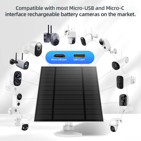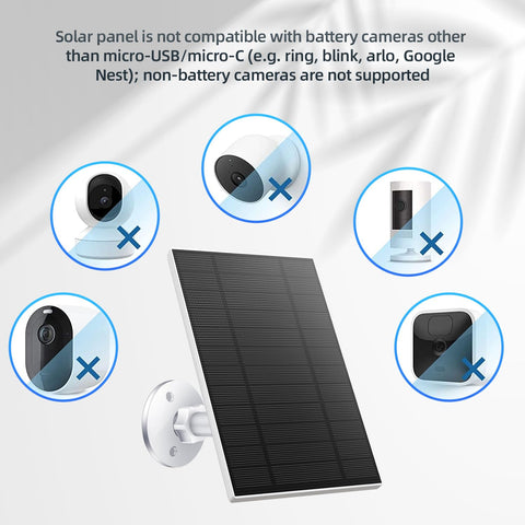 - 【5W Solar Panels Compatibility】5W solar panels is compatible with DC 5V rechargeable battery cameras with micro USB and USB Type-C port for Security Cameras Wireless Outdoor, Compatible with USB and USB Type-C port Rechargeable Battery Security Camera. NOTE:This Solar Panel is Not compatible with Eufy, Arlo, Blink, Ring, Google Nest, Kasa cameras. This solar panel is not compatible with any plug-in camera without battery.