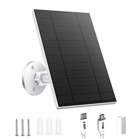 - 【Packing List】1*5W solar panels, 1*360° adjustable wall mounting bracket, 1*screws bag, 1* USB Type-C port, 1*manual, 20PC Cable Clips .