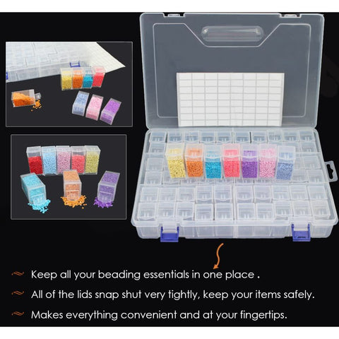 - New Design 60 Grids Big-Capacity Containers: Each container can hold about 14 bags of 200 drills (2800 approx.), which is bigger than other tic tac jars. Keep all your beading essentials in one place with this 60-piece tiny storage container. All of the lids snap shut very tightly, keep your items safely.