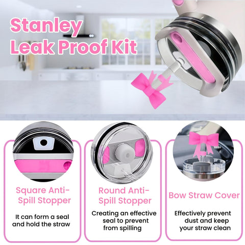 - 【Stanley Decor】For stanley cup accessories 30oz 40oz. Including through 1pcs bow shaped straw topper, 1pcs letter charm chain accessory specially customized for Stanley Tumber handle, 1pcs round anti-spill stopper, 1pcs square anti-spill stopper, 1pcs cup boot, 1pcs diamnod letter sticker
