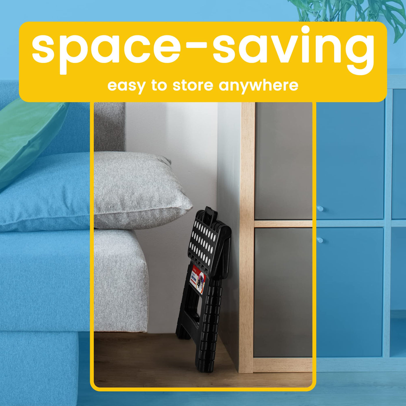 - CARRYING HANDLE - Ergonomic carrying handle is designed for easy folding and carrying. Just lift the handle, it will fold easily and quickly in a split second with only one hand. The step stool’s handle magically appears when the stool is folded flat. Allowing you comfortably carry it around so they can place it where they need it.