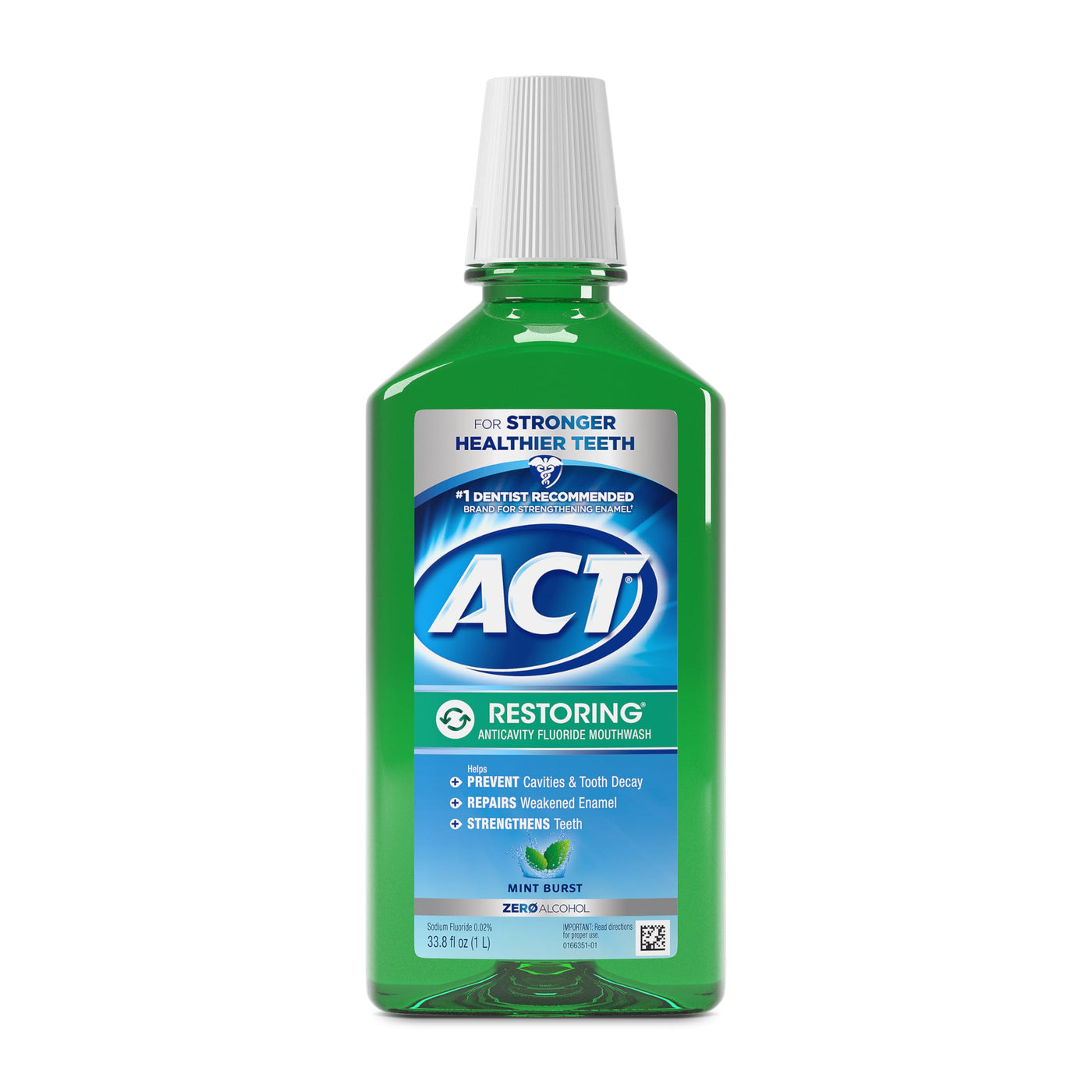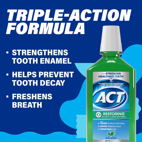 Details: Help protect your teeth from weakening enamel and tooth decay with ACT Restoring Zero Alcohol Fluoride Mouthwash, Strengthens Tooth Enamel, Mint Burst. This mouth rinse is designed to help strengthen tooth enamel, remineralize soft spots, prevent cavities and freshen breath. In fact, anticavity rinses like ACT Restoring Mouthwash are up to 70% more effective at reducing cavities versus brushing with a fluoride toothpaste alone. This ACT Restoring Mouthwash comes in a Mint Burst flavor and is an alcohol-free mouthwash. When it comes to strong smiles, trust the No. 1 dentist recommended fluoride brand*. *Among mouth rinses.