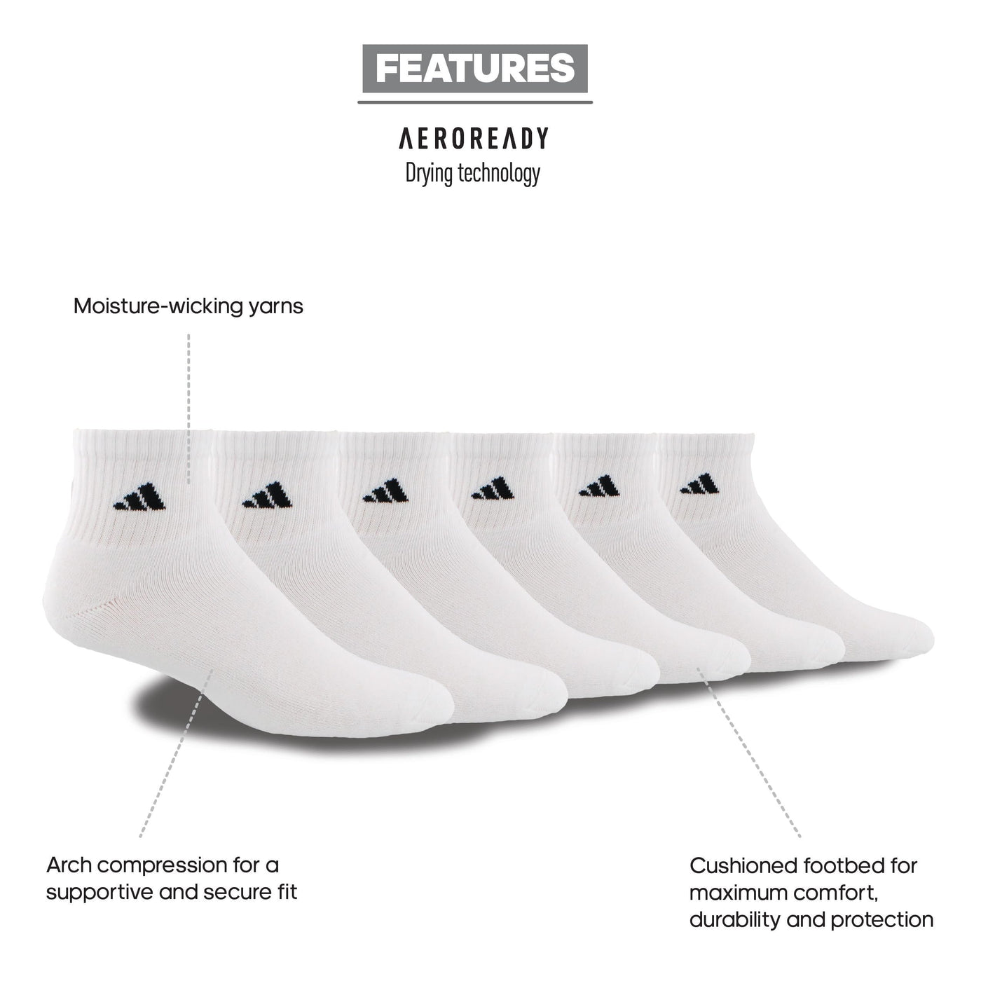 Experience a blend of quality, comfort, and durability with the adidas Men's Athletic Cushioned Quarter Socks, a suitable choice for those who demand the best in their daily wear. This versatile pack of socks for men offers a snug and secure fit, thanks to the innovative arch compression technology. Each pair is crafted to provide superior cushioning, making them great mens running socks for any active lifestyle. Made from moisture-wicking yarns, these socks for men keep your feet dry and comfortable, making them a practical choice as stocking stuffers for adults seeking performance and softness. Available in classic designs of white and black, these men's socks effortlessly blend with any outfit. With a focus on durability and comfort, this pack of socks ensures you'll have the reliable support you need, whether you're hitting the gym or just going about your day.