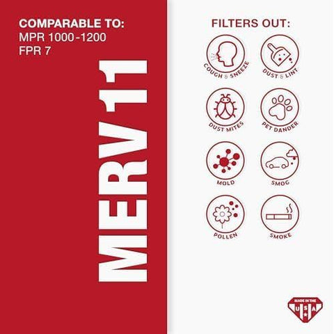 Details: Aerostar 20x25x1 MERV 11 Pleated Air Filters (Actual Size: 19 3/4"x 24 3/4" x 3/4") - 6 Pack. MERV 11 filters are comparable to MPR 1000-1200 and FPR 7. Designed for superior filtration efficiency, these filters are made with electrostatically charged synthetic material that draws and captures allergens between 0.3 - 1.0 microns, including lint, dust mites, mold spores, pollen, pet dander, fine dust, and smoke. Aerostar filters are a simple and cost effective step towards a healthier home environment, free of airborne allergens and particles that can trigger various allergy and asthma symptoms. They also improve the efficiency of your HVAC unit and therefore reduce maintenance and utility costs, by removing dirt and reducing strain on the motor. For best results, change the filter every 60 to 90 days but increase frequency to 30 days during peak summer and winter months when your unit is working the hardest. Compatible with furnaces and AC units.