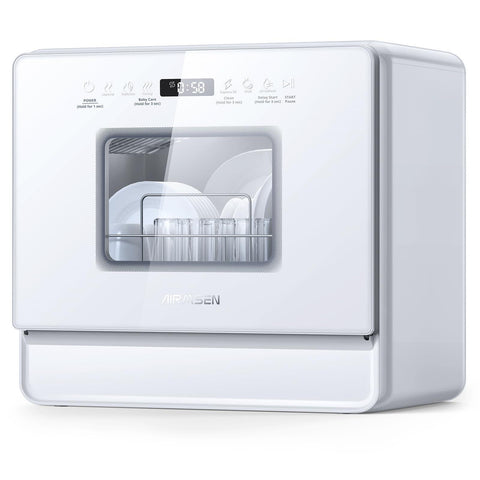 - Sleek Design & High Capacity: A01 countertop dishwasher features a slim profile, saving valuable countertop space. Ideal for small kitchens and families (5-6 people), it can accommodate plates up to 11.8 inches in diameter when the upper basket is removed.