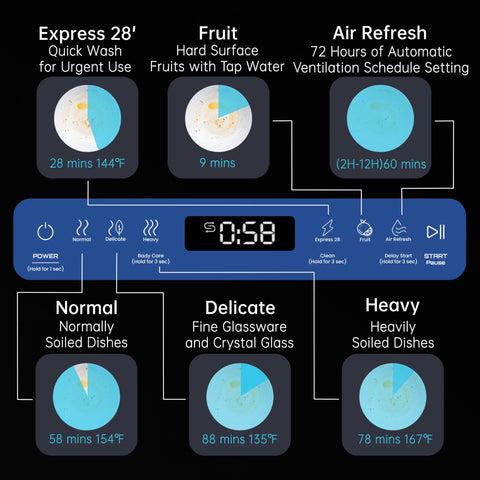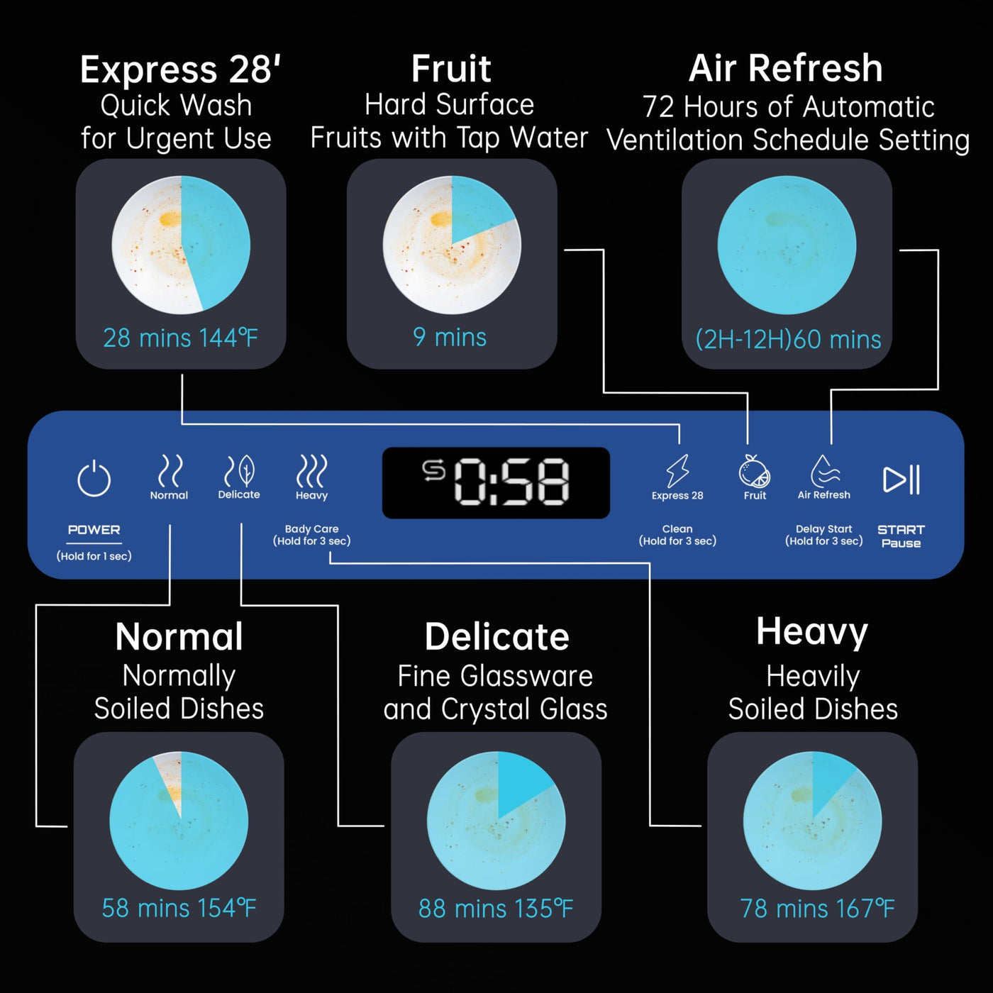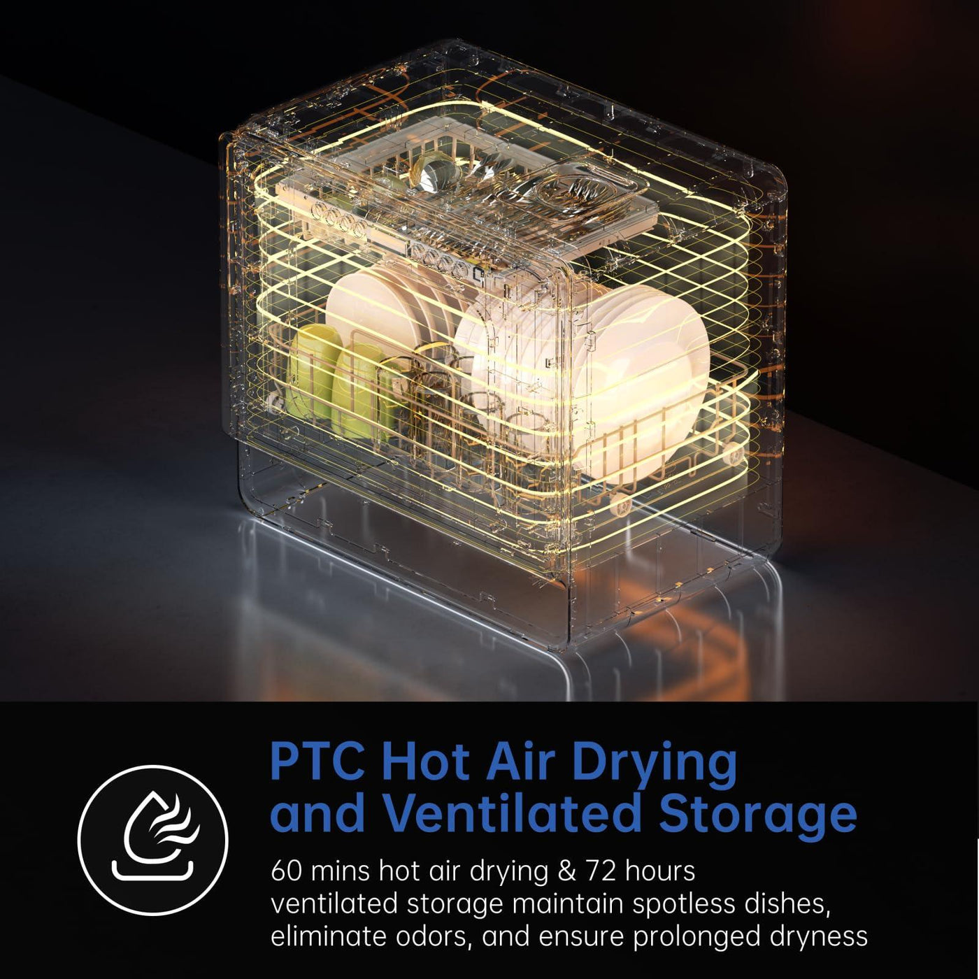 - High-Temperature Cleaning: The mini dishwasher includes a Hygiene Cycle that heats water to 167°F, sanitizing dishes (even baby bottles) and removing tough stains. It also provides 60 minutes of hot-air drying and 72-hour automatic ventilation to keep dishes and the interior dry and fresh long-term.