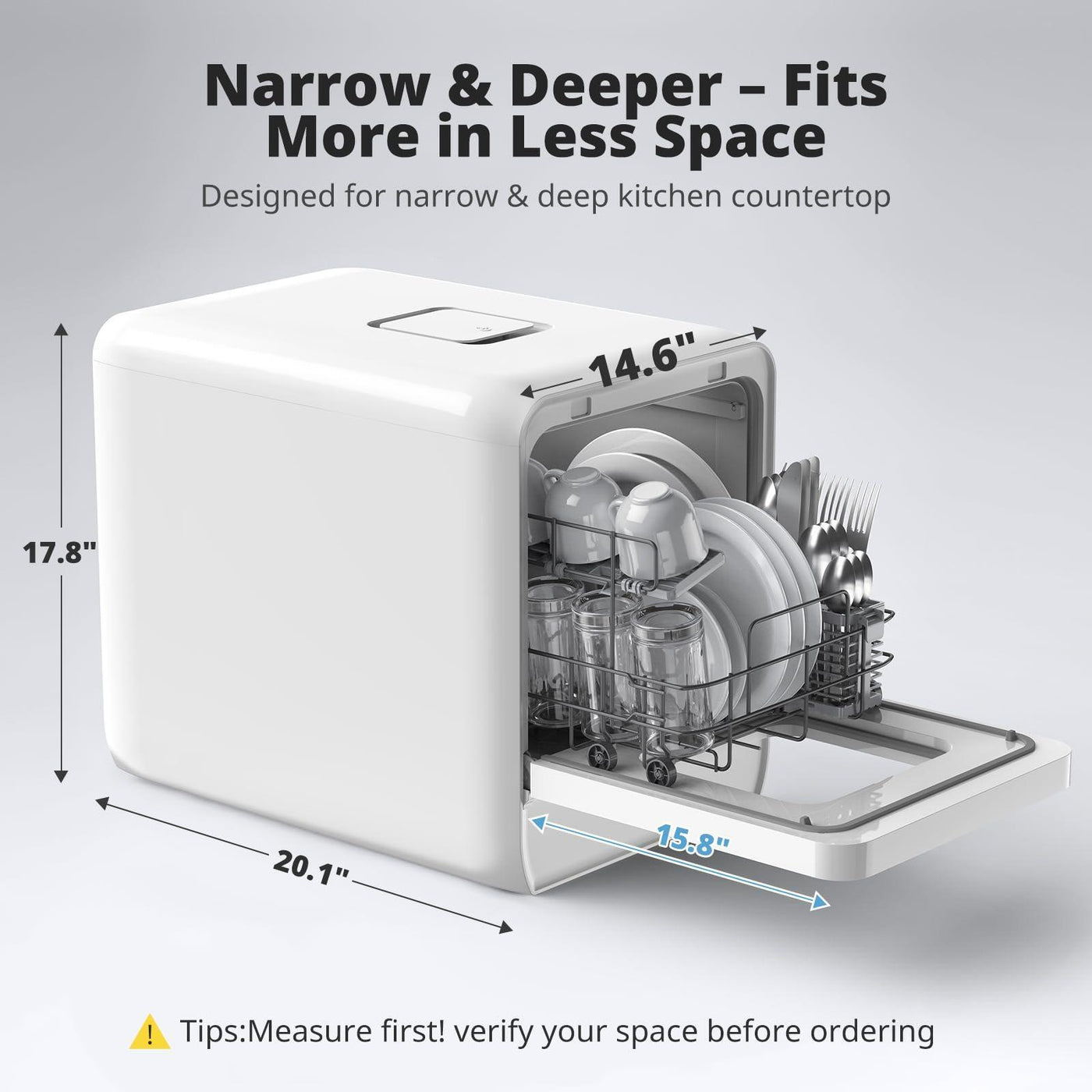 - ULTRA-NARROW DESIGN : The compact C01 dishwasher, at just 14.6” wide, saves 20% kitchen space compared to standard 16.75” models, helping small kitchens feel less cramped. Its optimized interior fits 4 place settings like a 17” counter top dishwasher, making multiple washes a thing of the past.