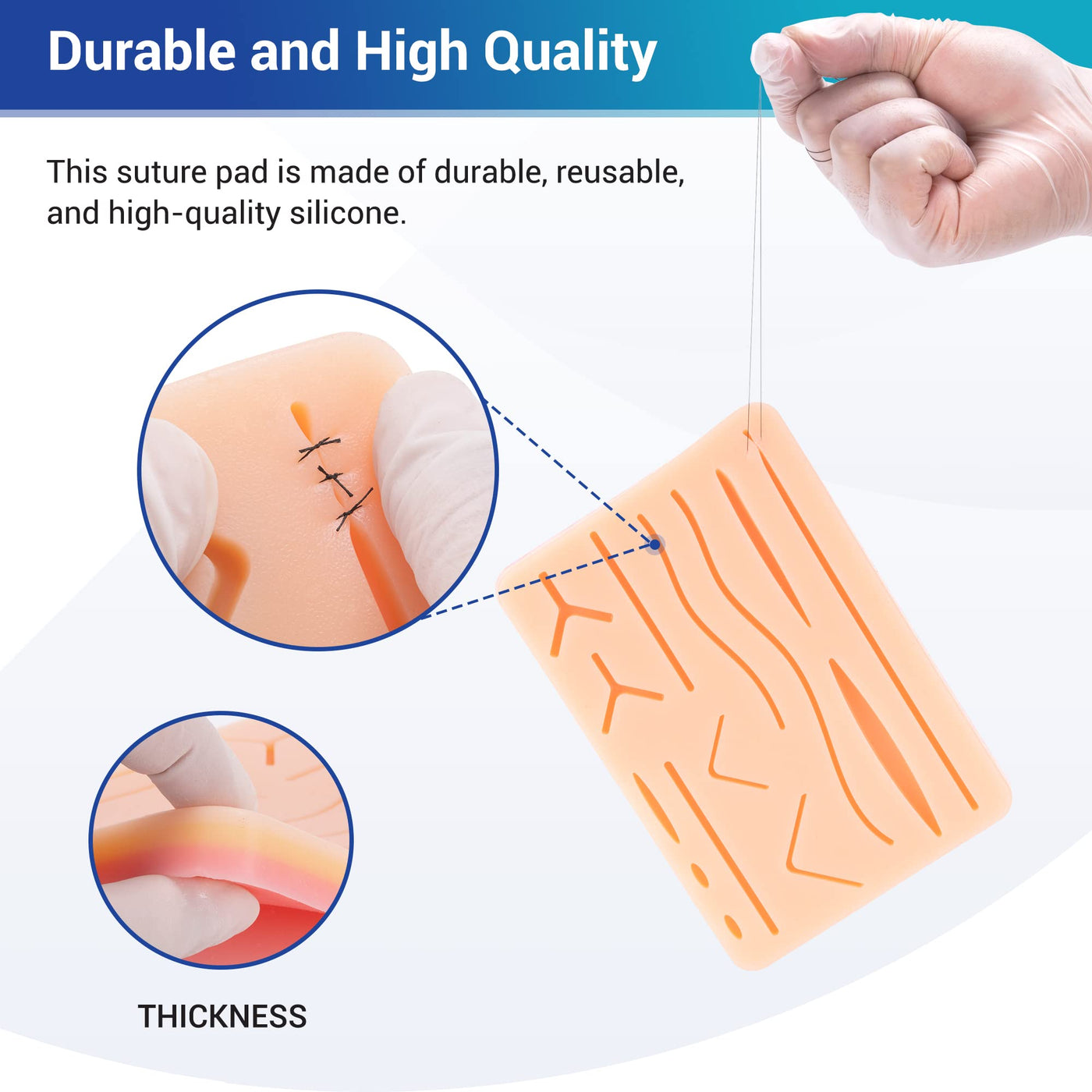 - DURABLE AND HIGH QUALITY - The durable, reusable, and high-quality suture pad is designed to replicate the anatomical structure of human tissue. It provides three layers to provide the best human tissue simulation possible: Skin, Fat, and Muscle. The suture pad also features an improved built-in "mesh layer" between the skin and the fat layers. This feature improves the durability of the suture training pad and prevents rips of the skin layer for the most realistic simulation.