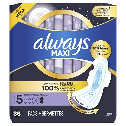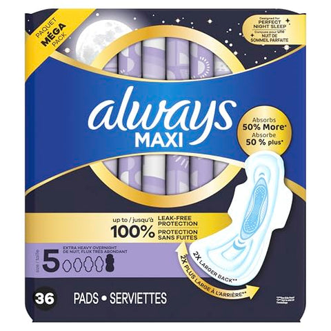 Details: Always Maxi Overnight Pads provide you a PERFECT NIGHT SLEEP with 2X more coverage on the back for up to 100% Leak Free Comfort, no matter how you sleep. If you’re looking for uncompromised period protection, you’ve come to the right place. Always Maxi Pads ABSORB 50% MORE vs. same size Always Ultra Thin. Additionally, Always Maxi Pads also feature the Always advanced 3X Protection System to give you up to 100% leak free protection throughout your days and nights. Always Maxi Pads possess RapidDRY Technology, which works to wick away gushes fast to absorb more than you may need. The LeakGUARD core locks in leaks for long-lasting protection to keep you fresh and clean, and SecurelyFITS helps the pad stay in place throughout no matter what you do. Make sure that you are getting the right protection from your pad, as using the wrong pad size can lead to leaks. Always Maxi Pads come in a range of sizes fit your flow and size perfectly depending on your needs. If you have a light flow or need a teen-sized pad, then we would recommend using our Always Maxi Pad size 1 to 3. If you have a heavy flow or want overnight protection, then we recommend using our size 4 or 5 Always Maxi Pad. We've got your flow covered day and night for up to 100% leak-free comfort.