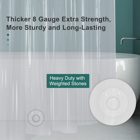 - Heavy-duty clear weighted stones - The 3 big weighted clear stones at the bottom give weight to the plastic shower curtain liner, keeping the shower curtain in place and away from your body. And water won't splash out all over the floor.