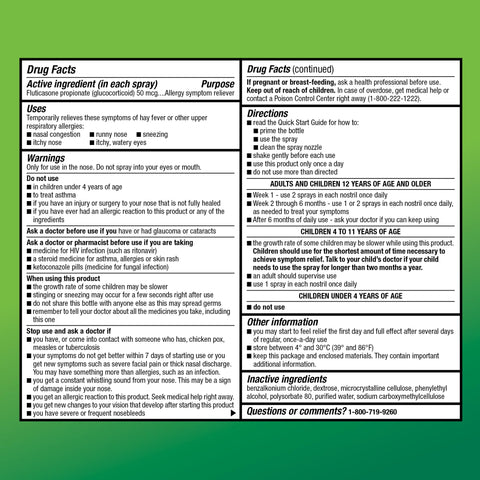 Details: Compare to the active ingredient in Flonase Allergy Relief. When You're suffering from nasal congestion and other allergy symptoms, turn to Basic Care Allergy Relief Nasal Spray. This non-drowsy nasal spray contains the active ingredient Fluticasone Propionate (Glucocorticoid), 50 mcg per spray which helps to clear nasal congestion and relieves symptoms of hay fever or other respiratory allergies: itchy, watery eyes; runny nose; itchy nose and sneezing.
