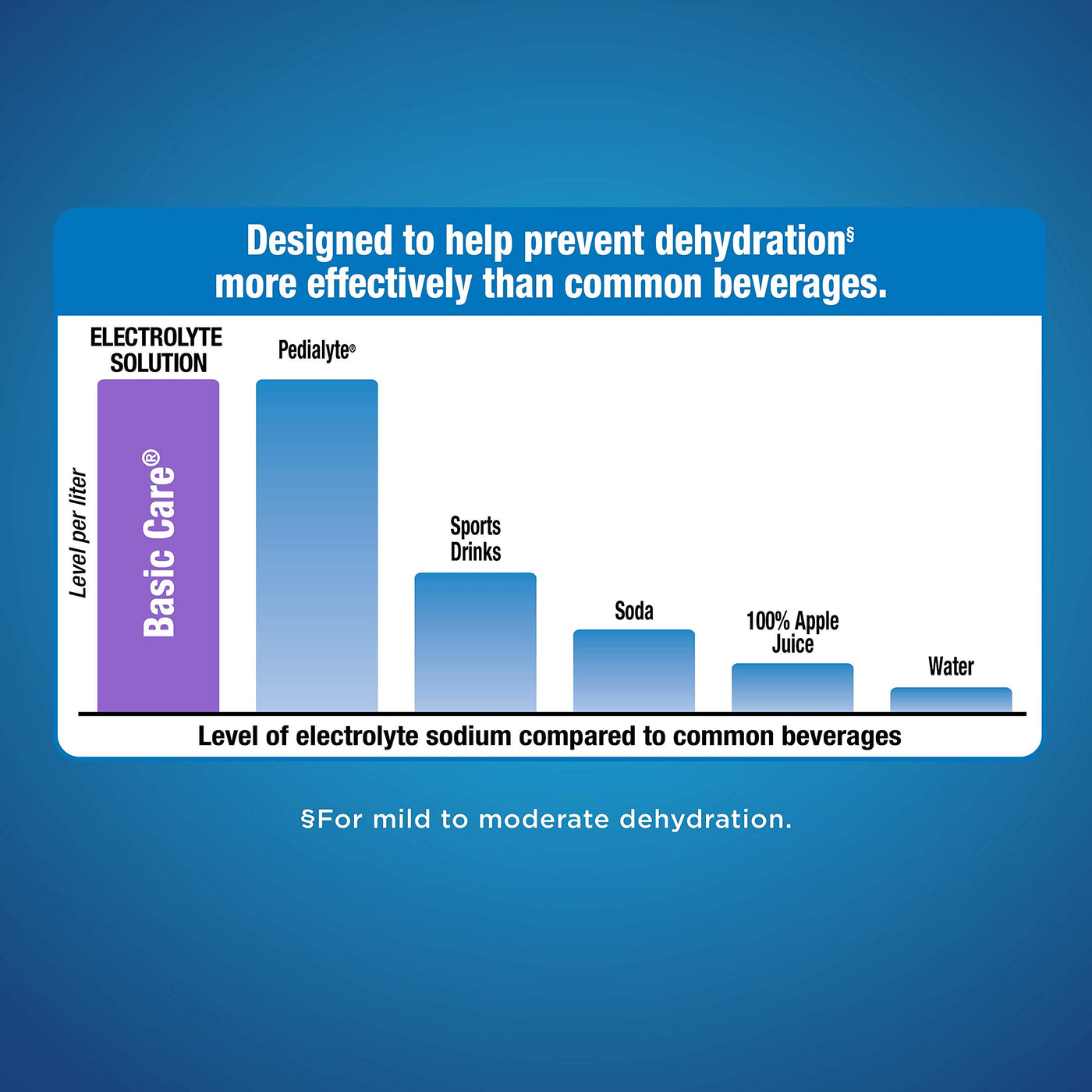 Details: Compare to Pedialyte. Amazon Basic Care Electrolyte Solution quickly replenishes fluids, zinc and electrolytes to help prevent mild to moderate dehydration in children and adults due to vomiting and diarrhea, intense exercise, heat exhaustion and travel. Amazon Basic Care Electrolyte Solution contains more electrolyte sodium compared to leading sports drinks, soda, 100 percent apple juice and water. Designed for fast, effective rehydration and features a Grape artificial flavor that is great for kids and adults. Amazon Basic Care Electrolyte Solution is recommended by pediatricians and pharmacists.