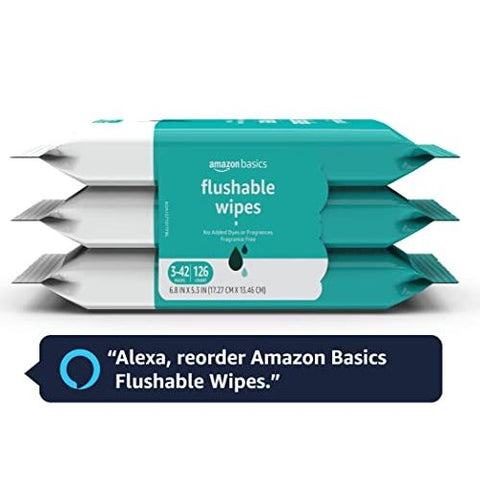 Amazon Basics Flushable Adult Toilet Wipes, Fragrance Free, 126 Count