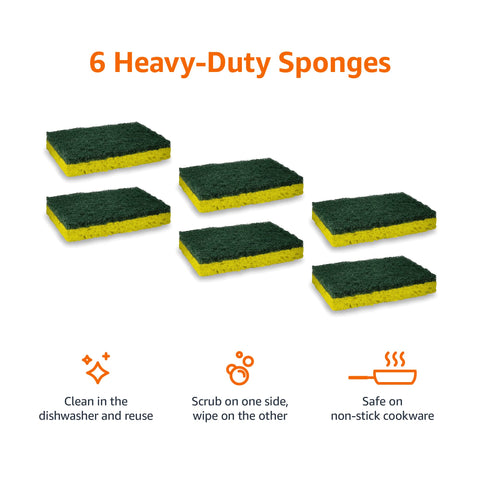 Details: Amazon Basics Heavy Duty Sponges, Scrub on one side, wipe on the other. Tough cleaning power for everyday jobs