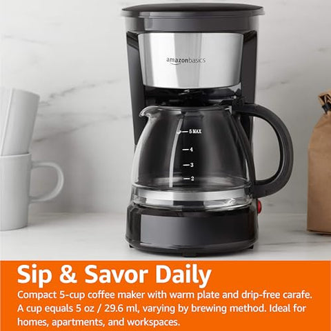 This automatic drip coffee fits neatly into any home, apartment, dorm room, or office coffee space. Featuring a stylish black and stainless steel finish, it adds an aesthetic touch to your kitchen counter while providing functionality with a reusable filter and drip coffee system. Its easy operation allows you to brew fresh, flavorful coffee at the touch of a button, guided by an ON/OFF indicator light. The warming plate keeps your coffee hot until you're ready to enjoy it. Compact yet mighty, this 5 cup coffee maker saves valuable counter space while delivering big on taste. The visible water window provides precision in measuring and prevents overflow, making every brew seamless.