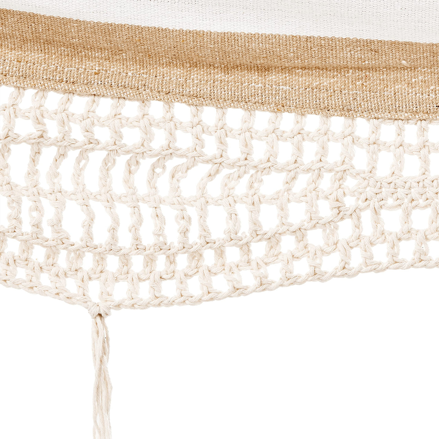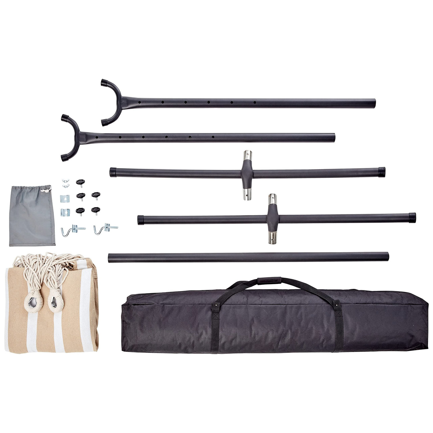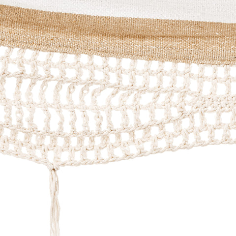 - Double hammock made of comfortable cotton & polyester with a Beige Stripe with Lace design, a steel stand, and a carrying case for the hammock