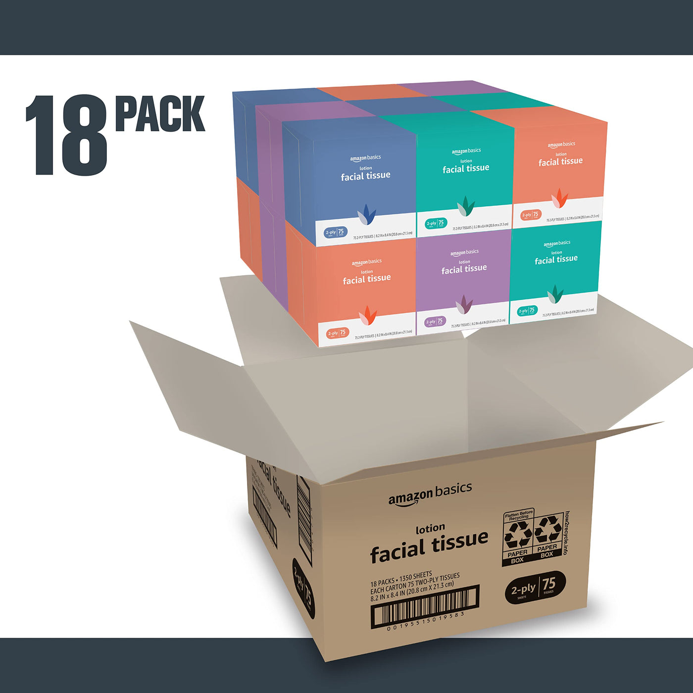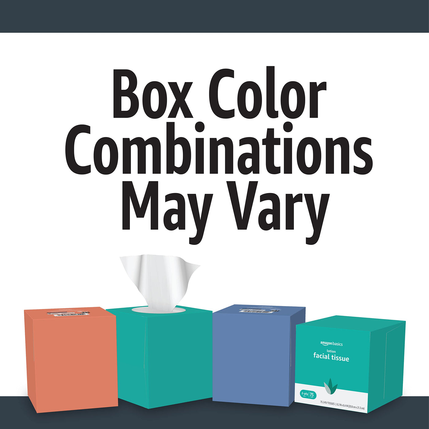 Details: Amazon Basics Facial Tissue with Lotion,Perfect for bathrooms, living rooms, bedrooms, offices, classrooms. Cube color combinations may vary