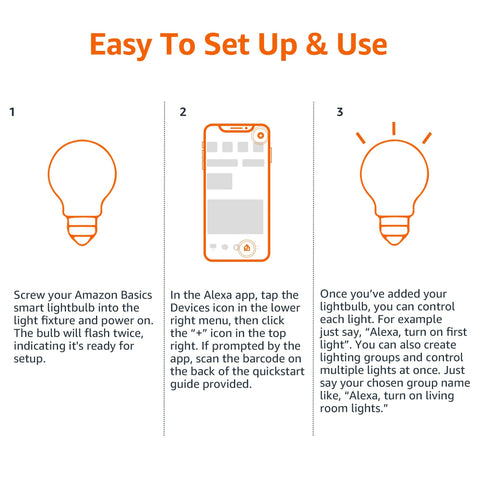 - SIMPLE TO SET UP WITH ALEXA: Screw in the light bulb, open the Alexa app, and get started in minutes as you get notified “ First light bulb found”. Otherwise, you can add the smart bulb directly from Alexa app. No hubs or 3rd party apps or skills required. For zero touch set up experience, check “Link device to your Amazon account to simplify setup” during checkout and get started with your smart bulb in no time. Note: Amazon Basics smart light bulbs work exclusively with Alexa to be set up with 2.4GHz Wi-Fi only.