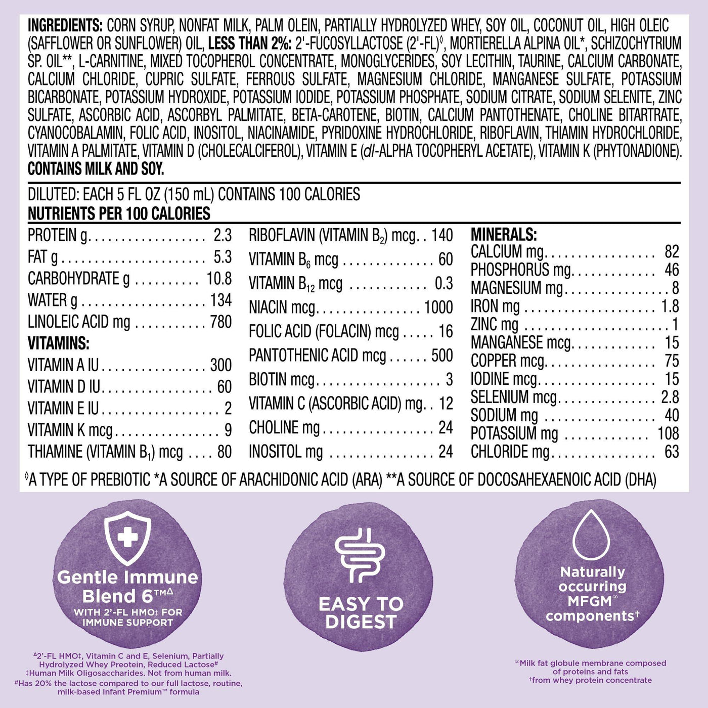 - GENTLE IMMUNE BLEND 6: With 2’-FL HMO, Vitamin C and E, Selenium, Partially Hydrolyzed Whey Protein, Reduced Lactose (has 20 percent the lactose compared to our full lactose, routine, milk-based Infant Premium formula)