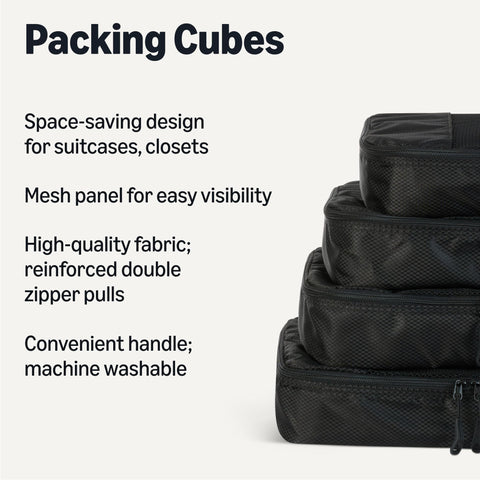 Amazon Essentials 4-Piece Packing Cubes Travel Accessories Set, Luggage Organizer with Double Zipper, Mesh Top, 100% Polyester, Medium, Black (Previously Amazon Basics)
