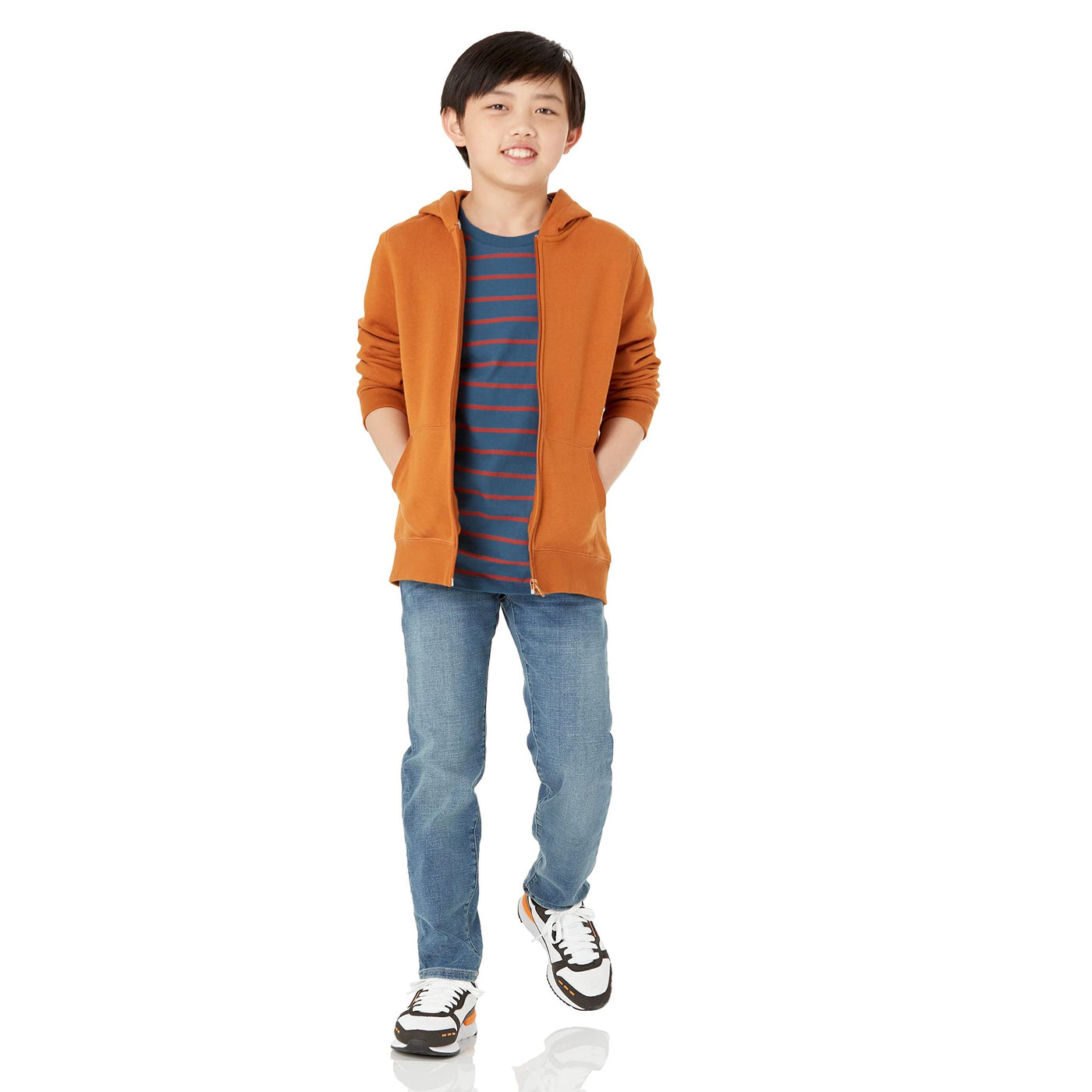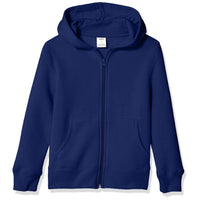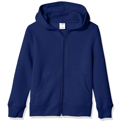 Crafted with soft, mid-weight cotton-polyester blend brushed back fleece, this zip-up hoodie offers comfort and warmth. This Essentials hoodie for kids features a relaxed fit, making it ideal for both lounging and outdoor adventures. The design includes a lined hood, stitched detail front pockets, and rib knit at the cuffs and hem, providing a snug fit. Available in multiple sizes, this hoodie meets the needs of growing boys. With its plain hoodie design, it works as a standalone piece or layered over other clothing. The zip-up style offers versatility, acting as both a cozy jacket and a comfortable kids hoodie for boys. Essential hoodies like these are designed with consistent sizing to eliminate the guesswork in finding the right fit. Whether you're searching for sweatshirts ideal for school or casual outings, or a hoodie that seamlessly matches any outfit, this boys sweatshirt combines practical style and long-lasting quality. This Amazon Essentials hoodie is crafted to meet high standards of durability, making it an essential piece for boys and toddlers alike.