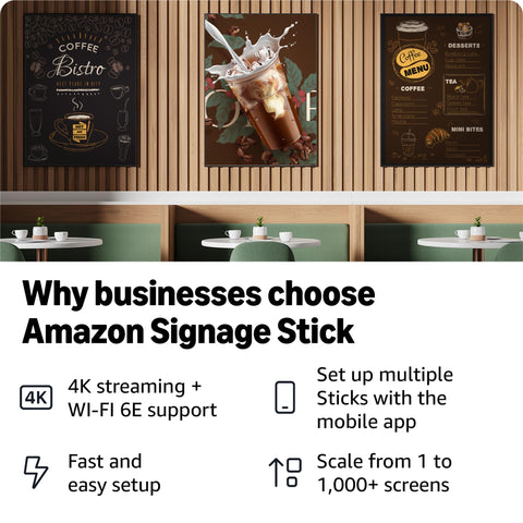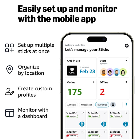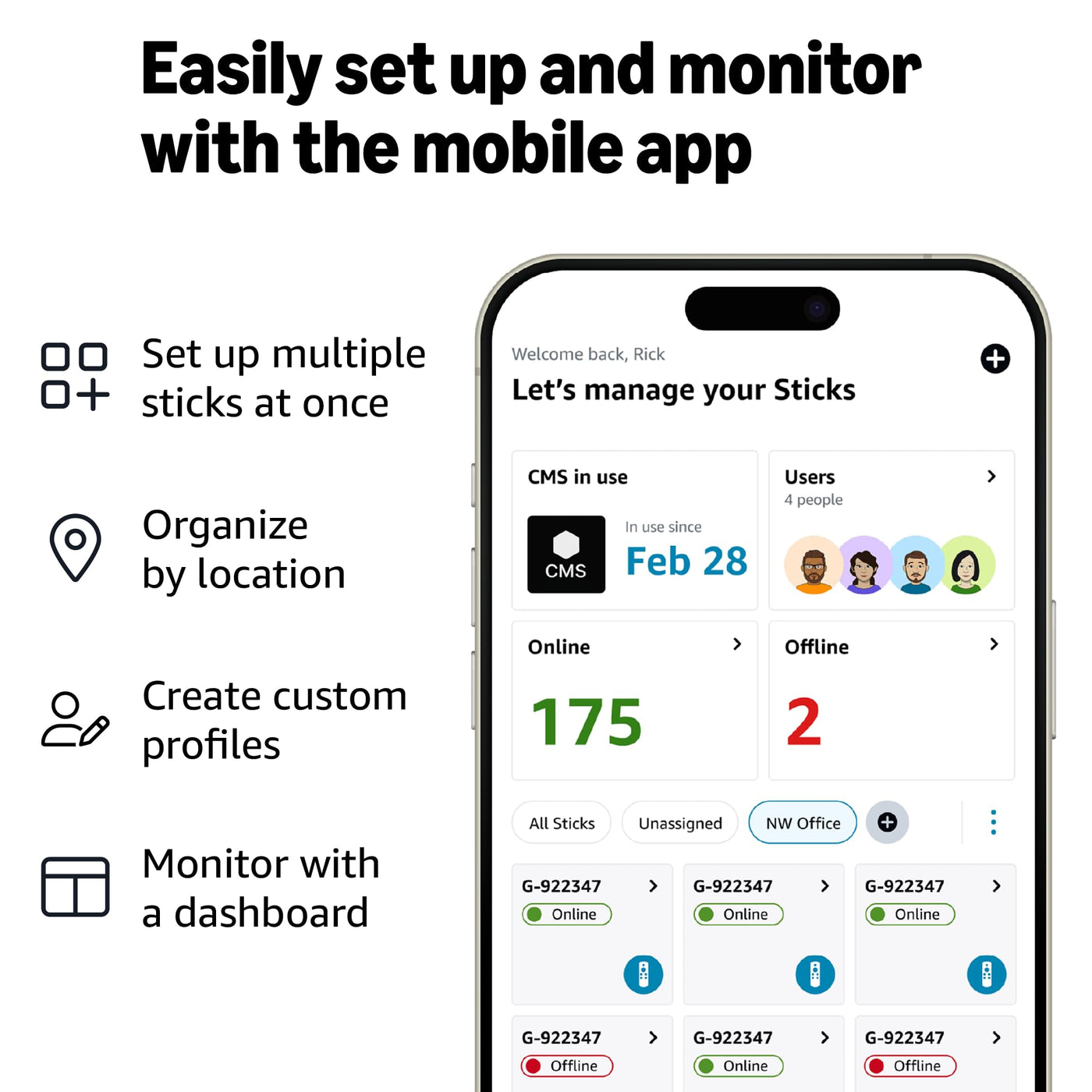 - New Amazon Signage app - set up multiple Signage Sticks faster and easier - no remotes needed. Plus, monitor all devices from a centralized dashboard.
