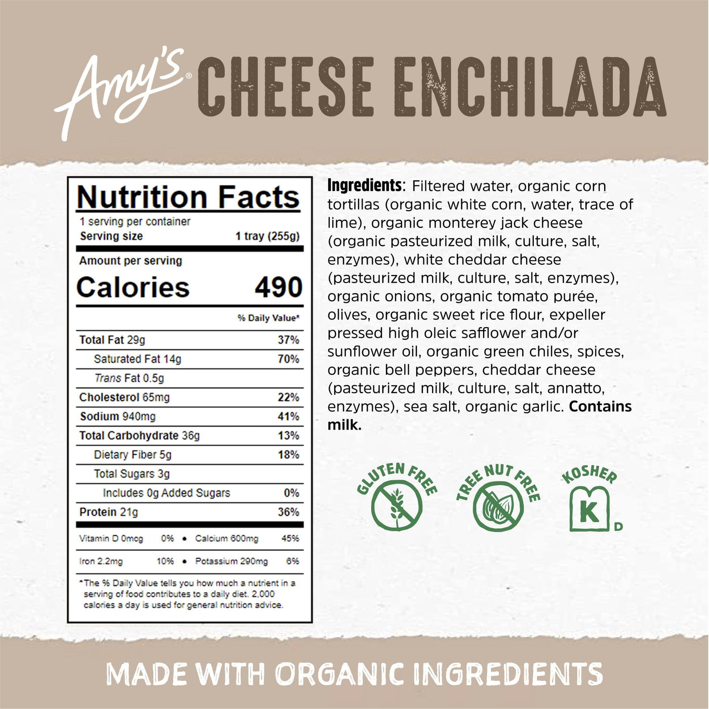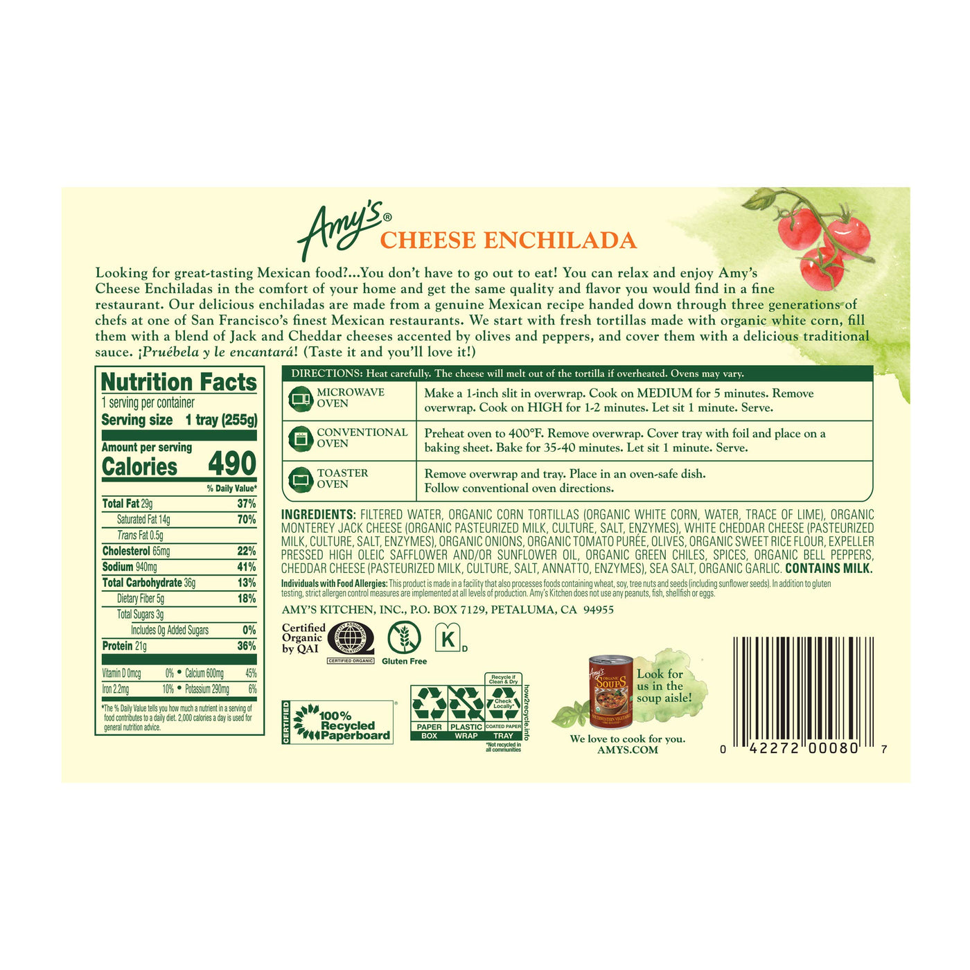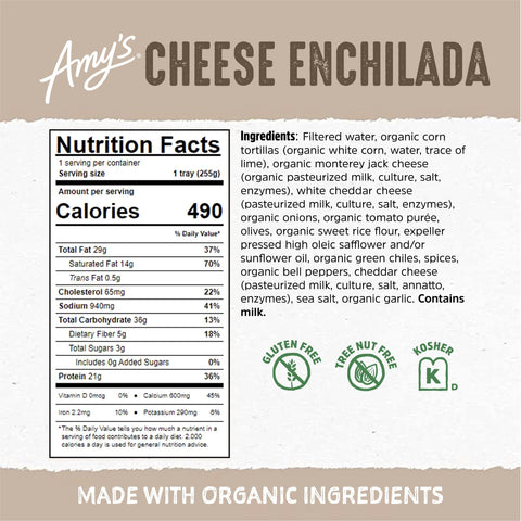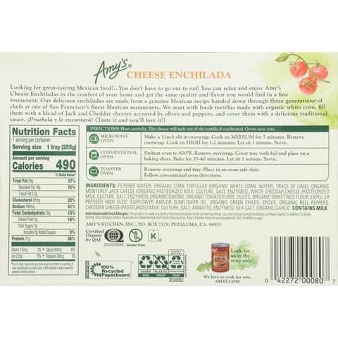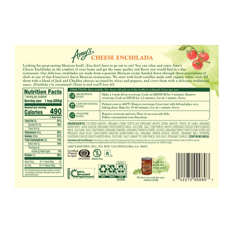 Details: This is comfort food, Mexican style! One box of Amy’s Cheese Enchiladas includes two tortillas made from ground organic corn filled with a blend of creamy cheeses, peppers and olives and covered in our tasty, traditional enchilada sauce. The recipe for our sauce has been handed down for generations, with a special blend of spices. Made with only the highest quality ingredients, Amy's Cheese Enchiladas are gluten free, soy and tree nut free, certified kosher and suitable for vegetarian diets. They’re also convenient and easy to prepare. Simply heat and serve! Since 1987, we at Amy’s Kitchen have produced delicious, convenient foods for people who are sometimes too busy to cook. Amy’s is a family-run business, and we supervise every aspect of our business and take pride in customer satisfaction. All the fruits, vegetables and grains we use are grown without the use of insecticides, GMOs and other harmful chemicals. We prepare these ingredients with the same careful attention in our kitchen as you would in your own home for high-quality, home-style vegetarian and vegan meals. No meat, fish, shellfish, poultry, eggs or peanuts are ever used in any Amy's products. Even though you're heating up our meals in your home, we want each bite to taste like you're a guest in ours.