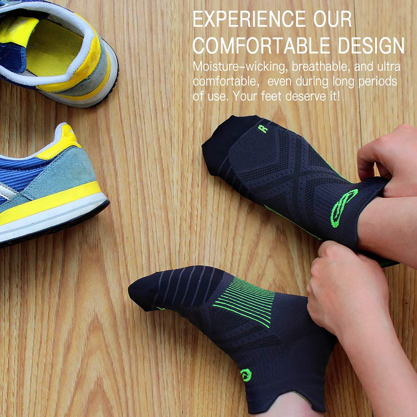 - [360 PROTECTION FOR YOUR FEET] The no show compression socks with 3d circular progressive pressure design provide you with permanent all-around protection, ensure your feet at the right angle to reduce sports injuries while providing ankle support