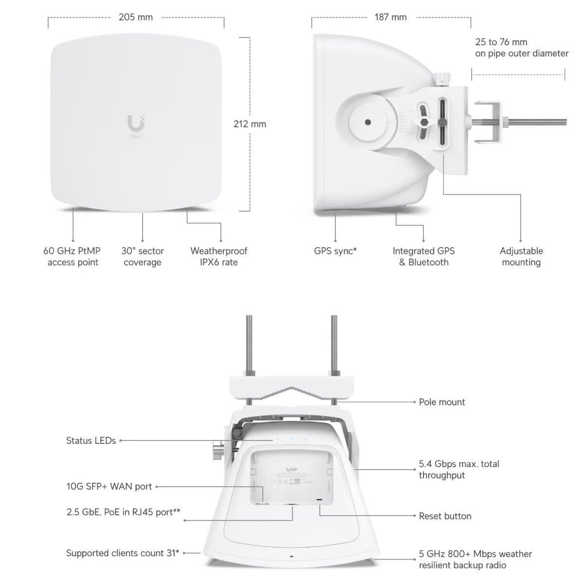 Details: 5 GHz backup radio Supported stations and distances: – Wave Long-Range: up to 8 km – Wave Nano: up to 5 km WAN Ports: (1) 10G SFP+, (1) 2.5GbE Integrated GPS antenna Link planning support via the ISP Design Center