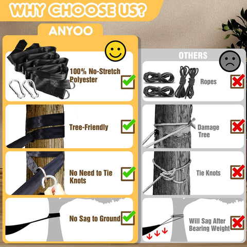 - Suspension System: It comes with tree-friendly high-density nylon straps and 2 carabiners, which makes it easy to set up and take down the hammock without damaging the trees. This type of suspension system used will bring you more comfortable and relaxing experience.The hammock structure is sturdy enough to support the weight of the hammock and its occupants