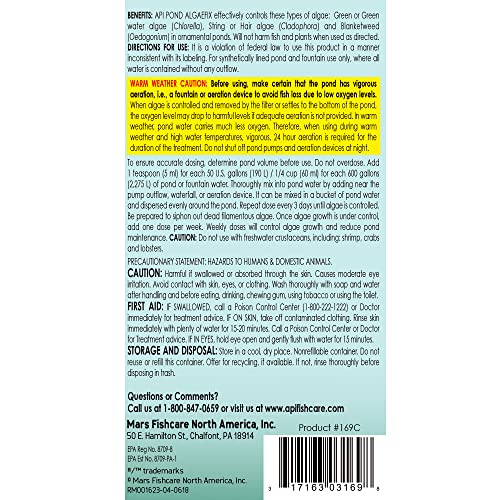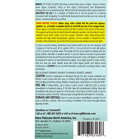 Details: Fast-acting API POND ALGAEFIX Algae Control works to control algae growth in ponds, water gardens, and fountains, keeping water clean and clear. API POND ALGAEFIX Algae Control works to control Green or Green water algae, String or Hair algae and Blanketweed. Will not harm fish and plants when used as directed. API POND ALGAEFIX Algae Control is for pond and fountain use only, where water is contained without any outflow. Ponds must have adequate aeration to maintain sufficient oxygen levels for fish, especially in warmer weather. To determine accurate dosing for your pond size, measure the pond volume before use. Do not use with freshwater crustaceans, including shrimp, crabs, and lobsters. With API POND products, it’s easy to keep a beautiful pond. For over 50 years, API has been creating innovative, research-driven solutions that make it easier to care for your pond. API POND Pond Treatment Supplies are designed to work in conjunction with each other to provide best results to control algae, promote healthy bacterial growth and help control and cure fish diseases and conditions such as ich and fin rot. They work to provide a safe, hospitable environment for fish such as koi, catfish, perch, goldfish and more. With API, you can spend more time admiring your fish, and less time scrubbing your pond. Make sure to use all products as directed in order to ensure the best results.