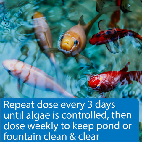 - Before use, make certain that the pond/fountain has vigorous aeration; thoroughly mix into pond/fountain water and disperse evenly; Repeat dose every three days until algae is controlled; dose weekly to keep pond or fountain clean and clear and to reduce maintenance