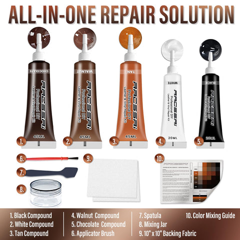 - LEATHER REPAIR KIT FOR FURNITURE : Match shades of brown, tan, walnut, chocolate and fix genuine leather or synthetic auto upholstery, steering wheel, purse, shoes, belt, peeling leather chair, wallet, furniture and so on